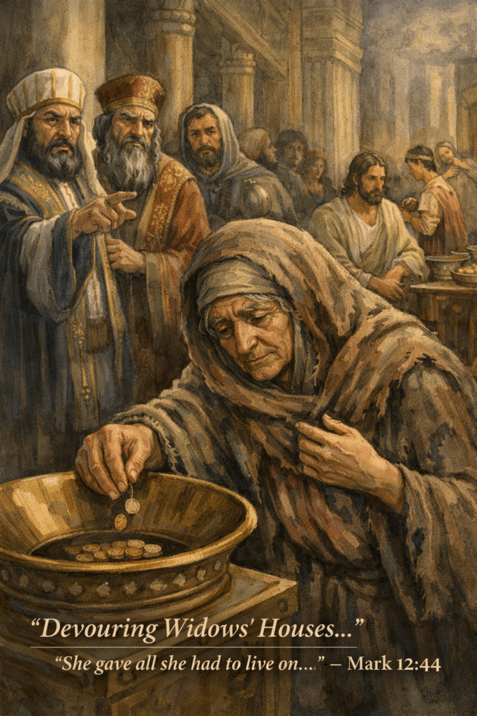 We cannot rip verses 41–44 from the passage around them and expect to understand what Mark is telling us. In verse 35, Jesus is teaching in the temple. By verses 38–40, He issues a blistering indictment of the scribes, men who loved their flowing robes, their seats of honor, and their lengthy public prayers. And then this: they “devour widows’ houses” (v. 40). That is not a minor footnote. Jesus says that because of this, “they will receive the greater condemnation.”